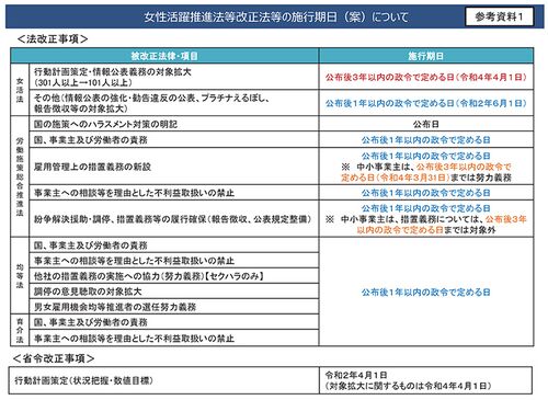 2019年12月4日の官報に、「女性の職業生活における活躍の推進に関する法律等の一部を改正する法律の施行期日を定める政令(令和元年政令第174号)」が公布されました。なお、パワハラ防止対策の法制化を含む女性活躍推進法等改正法の施行期日(案)をまとめ…